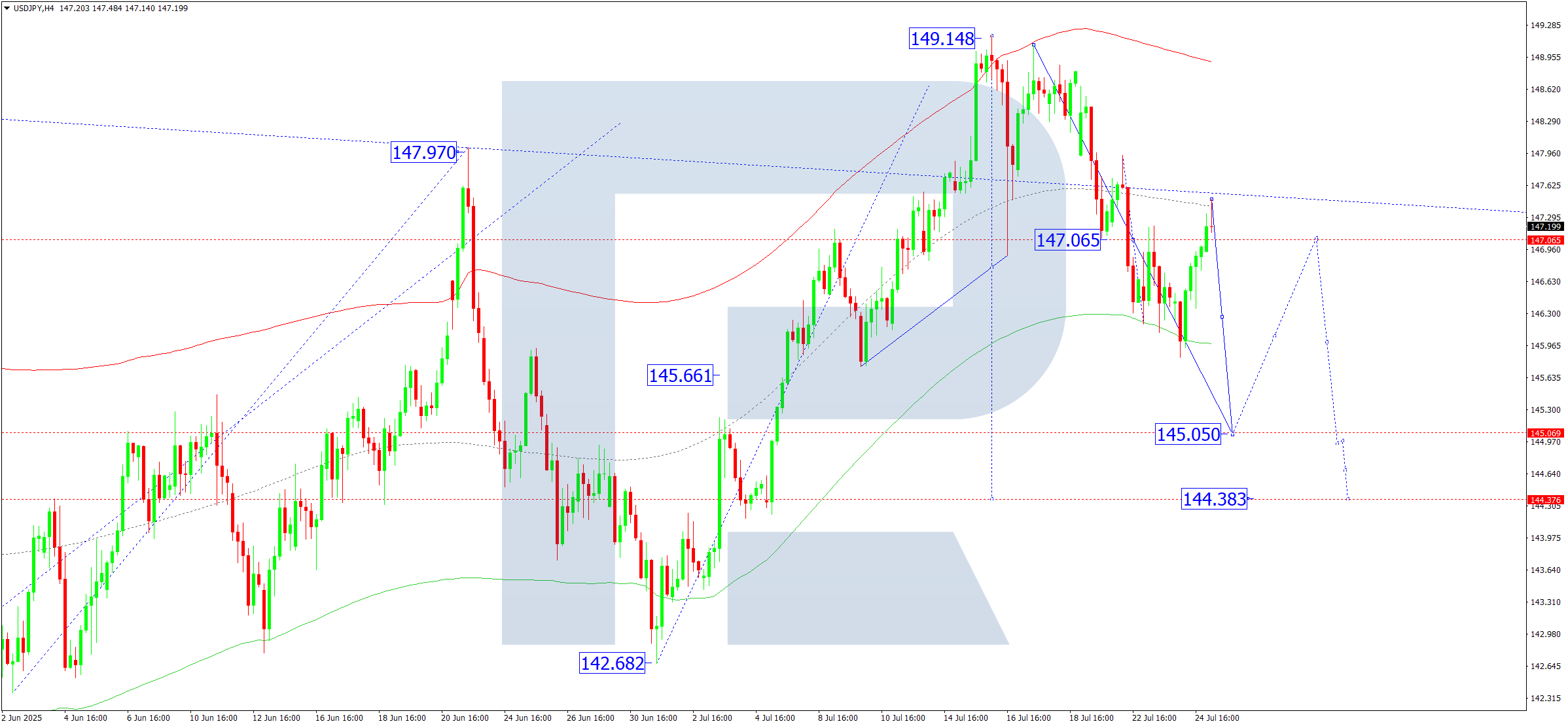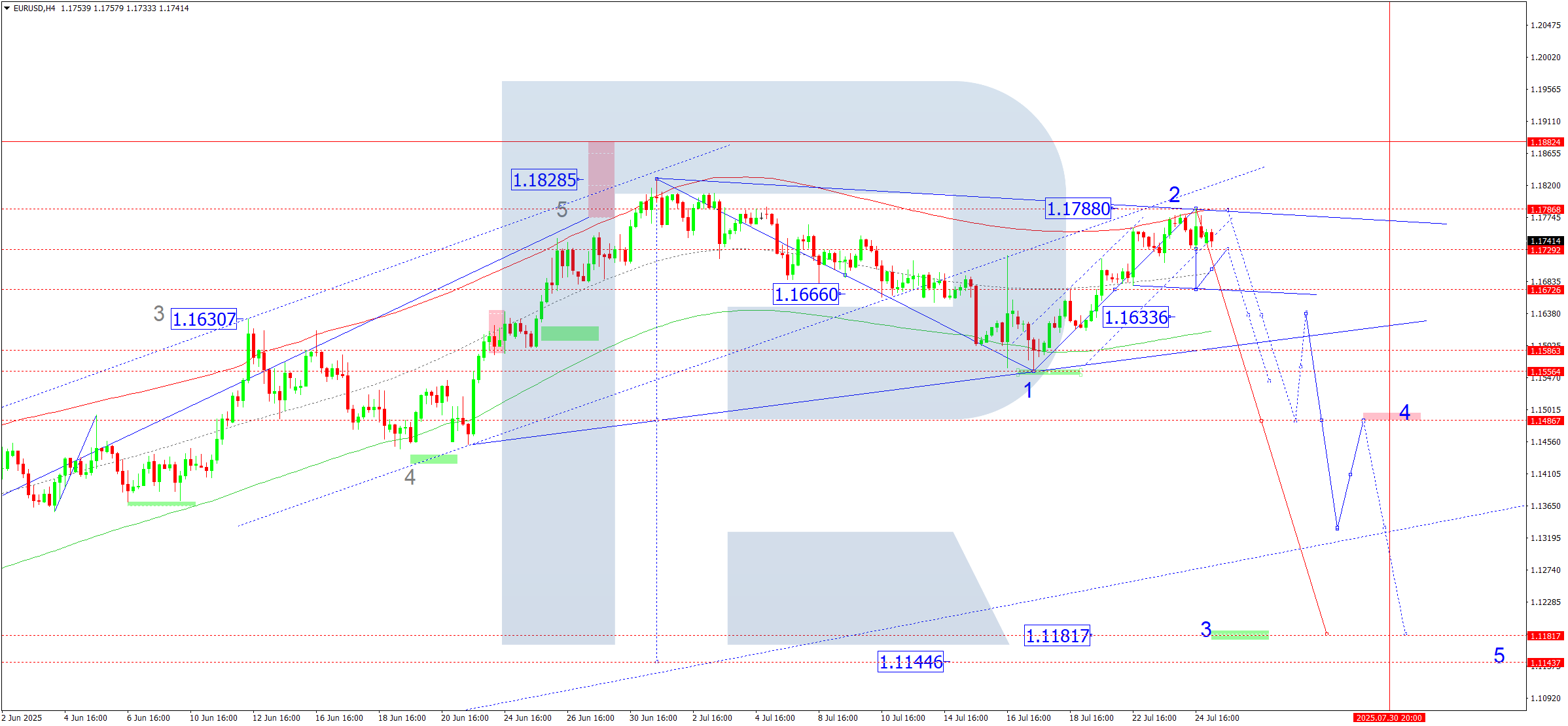 On the H4 timeframe, EURUSD has completed an upward movement reaching 1.1788. As of 25 July 2025, a downward impulse is developing, targeting 1.1676, followed by a possible pullback toward 1.1733. The pair is likely to establish a consolidation range near the recent highs. A break below this range could trigger a further decline toward 1.1555.