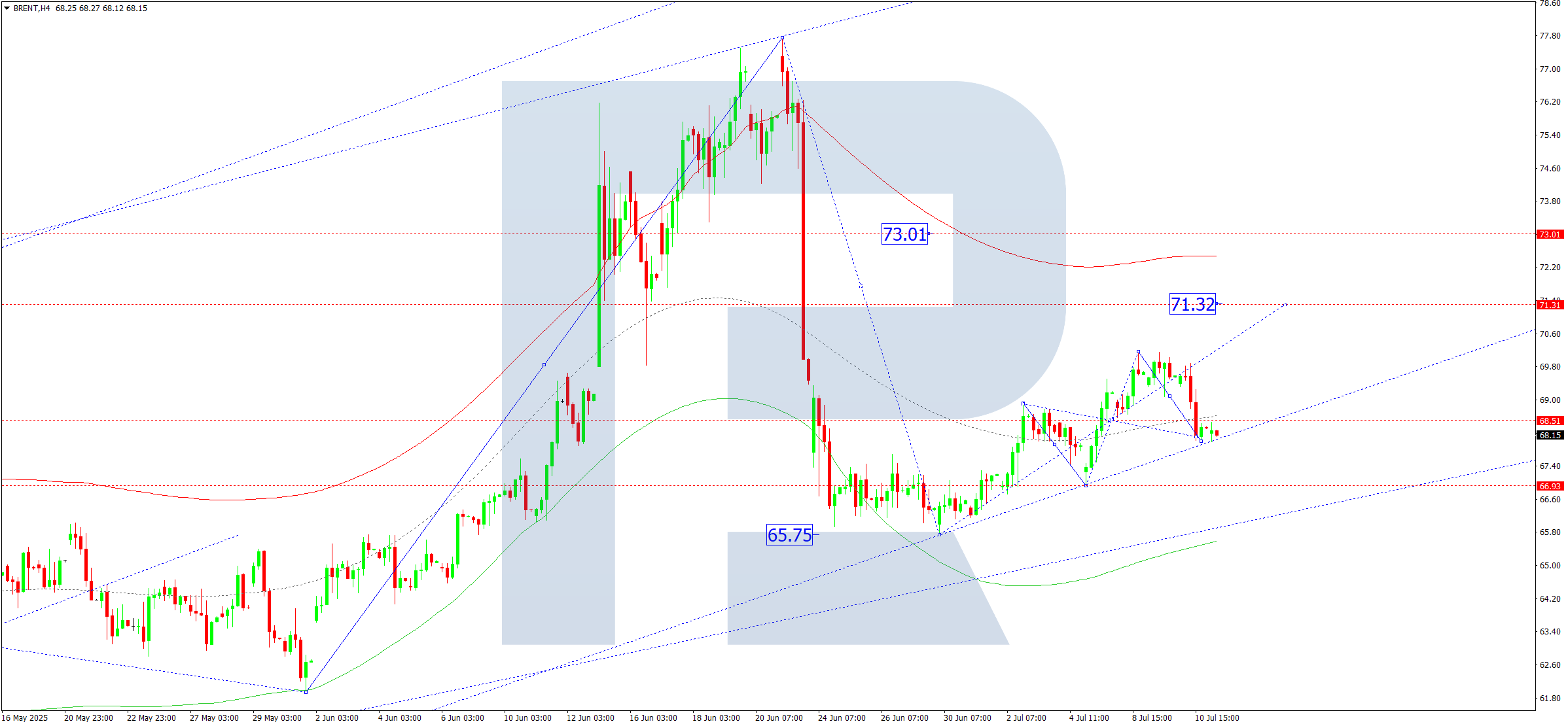 This scenario aligns with the Elliott wave setup and a bullish wave matrix centered at $69.50. Brent is currently consolidating near the mid-point of the Price Envelope, indicating room for further upside.
