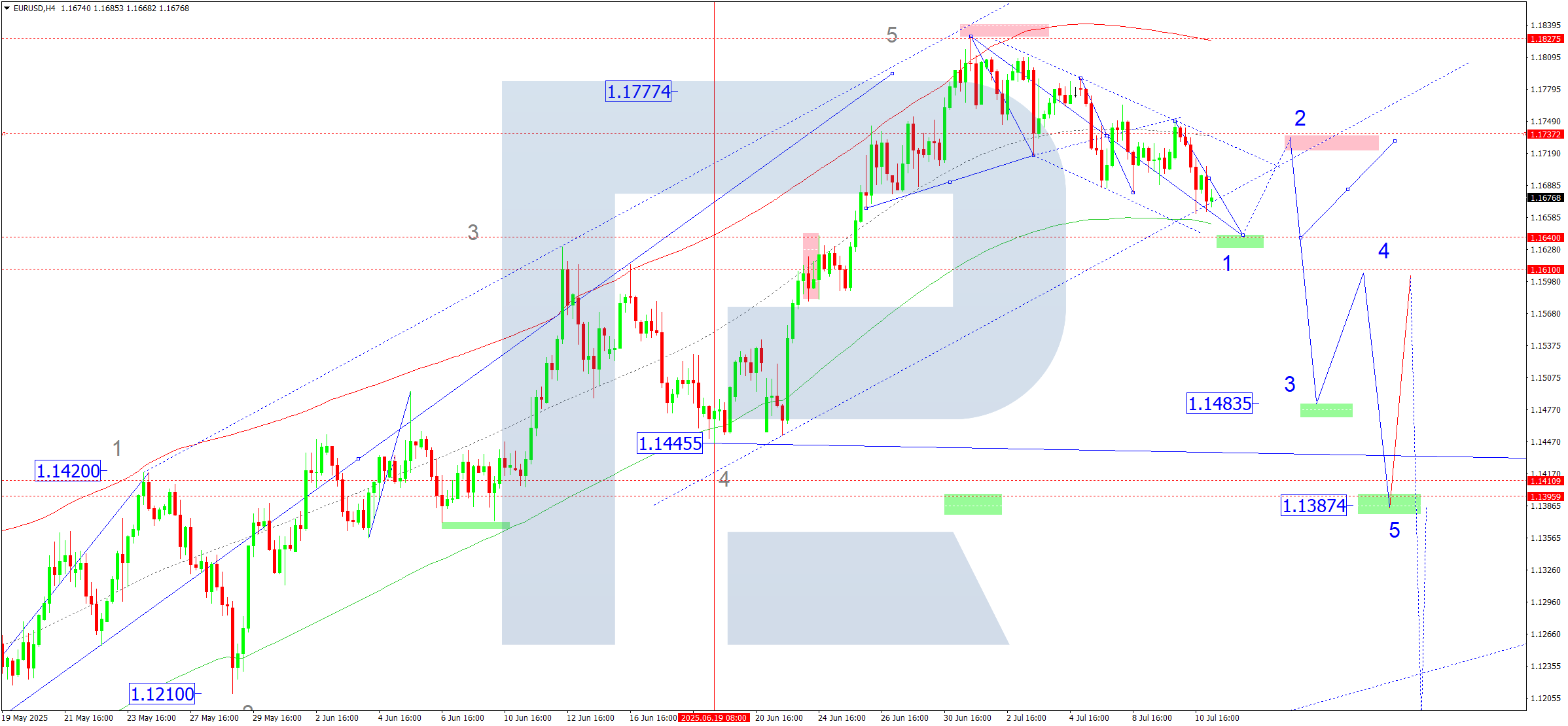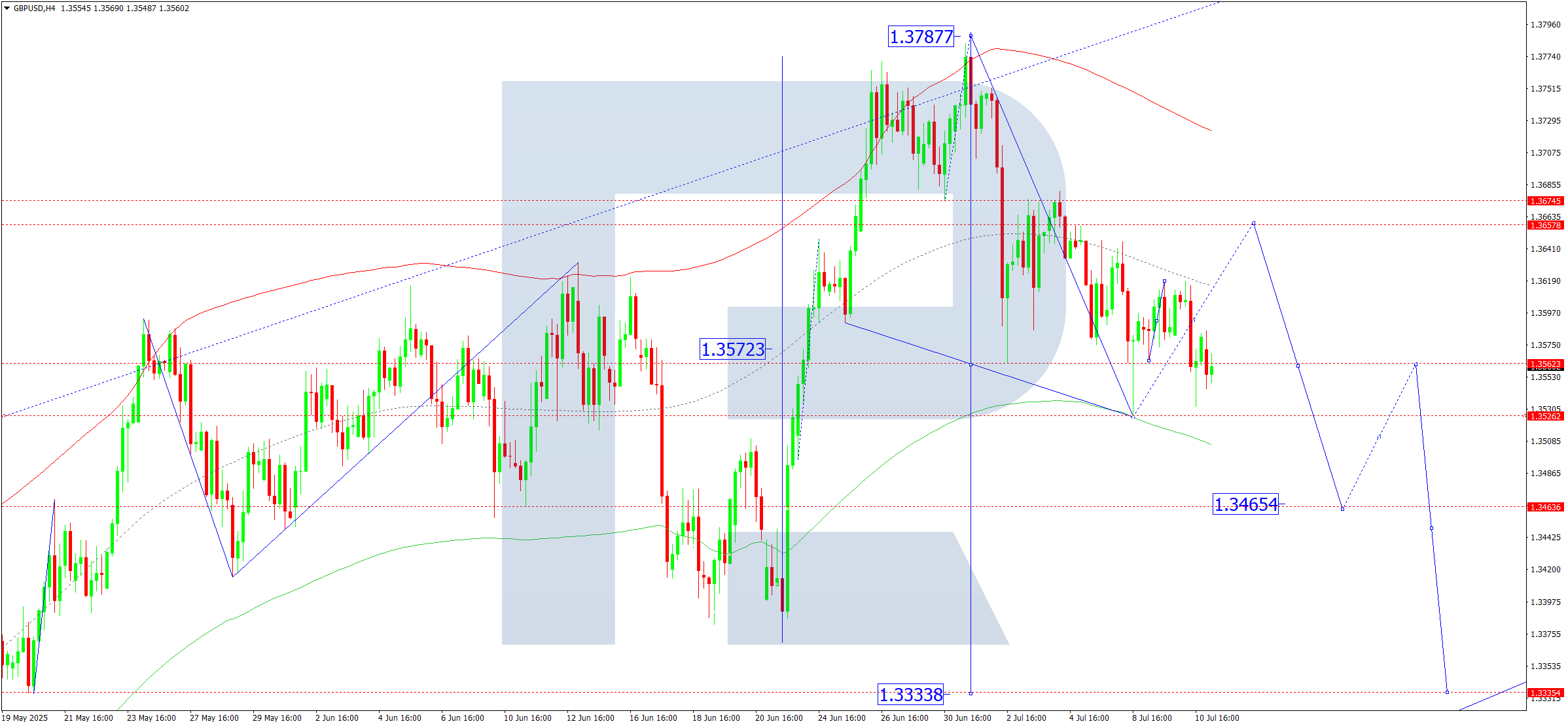 The forecast is consistent with the Elliott wave pattern and a bearish matrix centered at 1.3626. The price is currently consolidating near this level, with further downside toward the lower envelope boundary being the primary expectation.